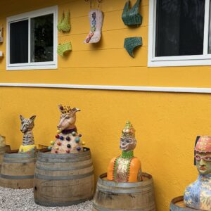 My work spans from whimsical anthropomorphic animals, political / media genres, sensual hearts , beastie planter heads , life size bikinis to landscape paintings on sculptural forms.