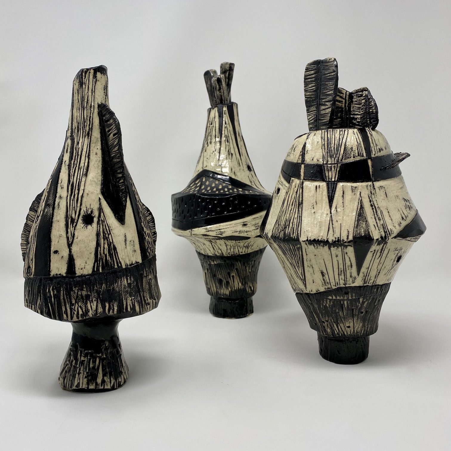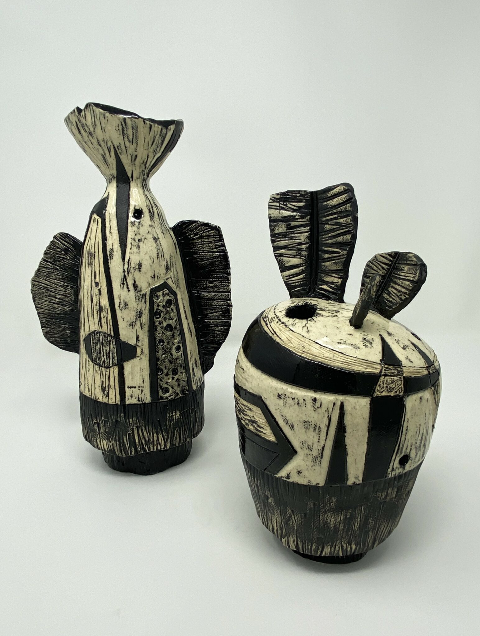 With that said, it is difficult for me to imagine only working in one medium. For many years I watched the ceramic process from afar, learning about form and different methods of firing and glazing by witnessing talented ceramic artists work. I was formally introduced to the unpredictable nature of clay when I began to create clay pieces to incorporate into my mosaic projects. One thing led to another, and I began to explore hand building and the sgraffito process.