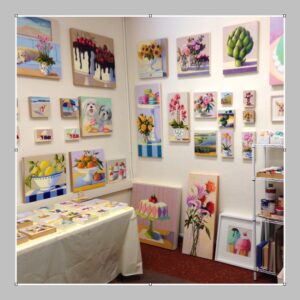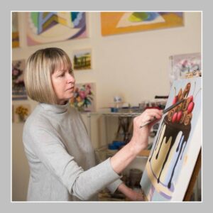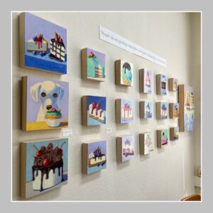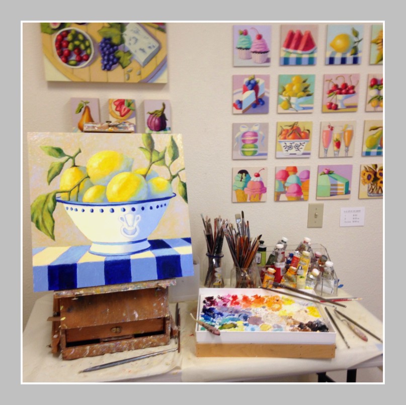People say my paintings make them smile, and I’m delighted they have that effect. My style is inspired by my previous work in the graphic design industry. Much of my work takes food as the subject matter for contemporary paintings. I am drawn to simple objects, most notably desserts, and like to establish good color relationships between light and shadow.