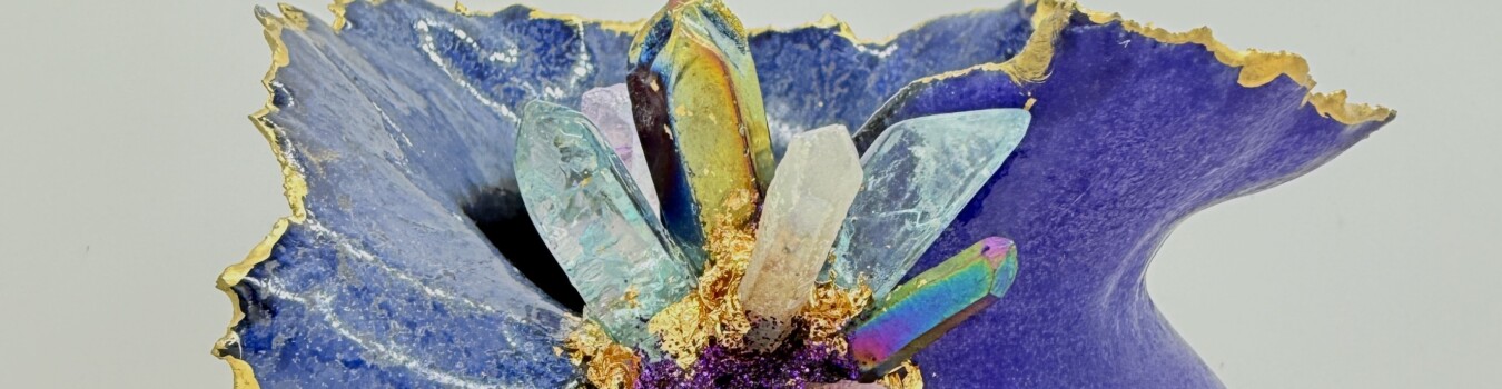My recent work, Crystal BOMB’s embodies the theme of imperfection. I make bowls and then I break them with a hammer. In the chaos of the break comes the randomness, no plan, and the outcome is always different. Then I repair them with crystals. Crystals grow by repairing emptiness—filling a broken or open place with more order and beauty than was there before. My work follows the same path: beauty forming in the cracks, strength rising from what has been broken, and new life taking shape where something once fell apart.