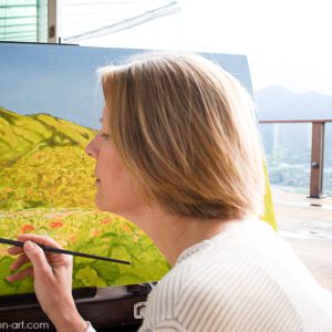 She has extensively traveled throughout California, Oregon, and the State of Washington. Along these travels, she is often inspired to paint the green or golden hills and tiny farms that sweep throughout these regions. Whether she is working on a joyful floral or a lush landscape, she is excited by the colors, shapes, and interplay with the paint.