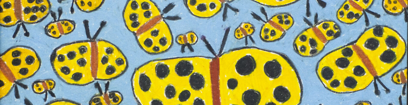 Butterflies, flowers, and ladybugs float through Cindy’s artwork. Often, they fill the sky in dizzying profusion, giving a buzzing energy to her Edenic vision. Sometimes she will include herself and her boyfriend, always smiling in their garden world. Her abstract colored pencil drawings exhibit the same sophisticated wealth of pattern and pure color. She easily invents new kaleidoscopic designs with which to fill the page. Cindy’s affinity for creatures and patterns has also resulted in charming sculptural projects, such as mobiles, bowls, and paper mache animals.